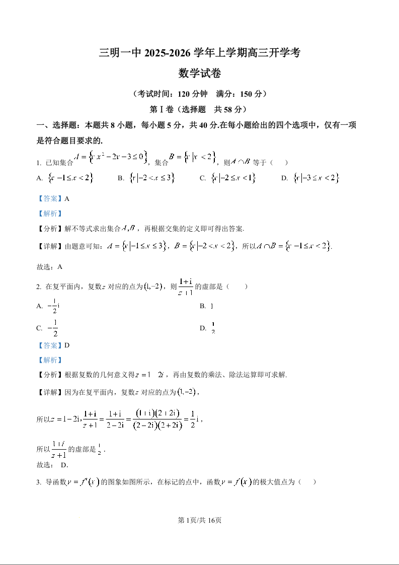高三数学(精品解析版)--福建省三明第一中学2026届高三上学期8月开学考试