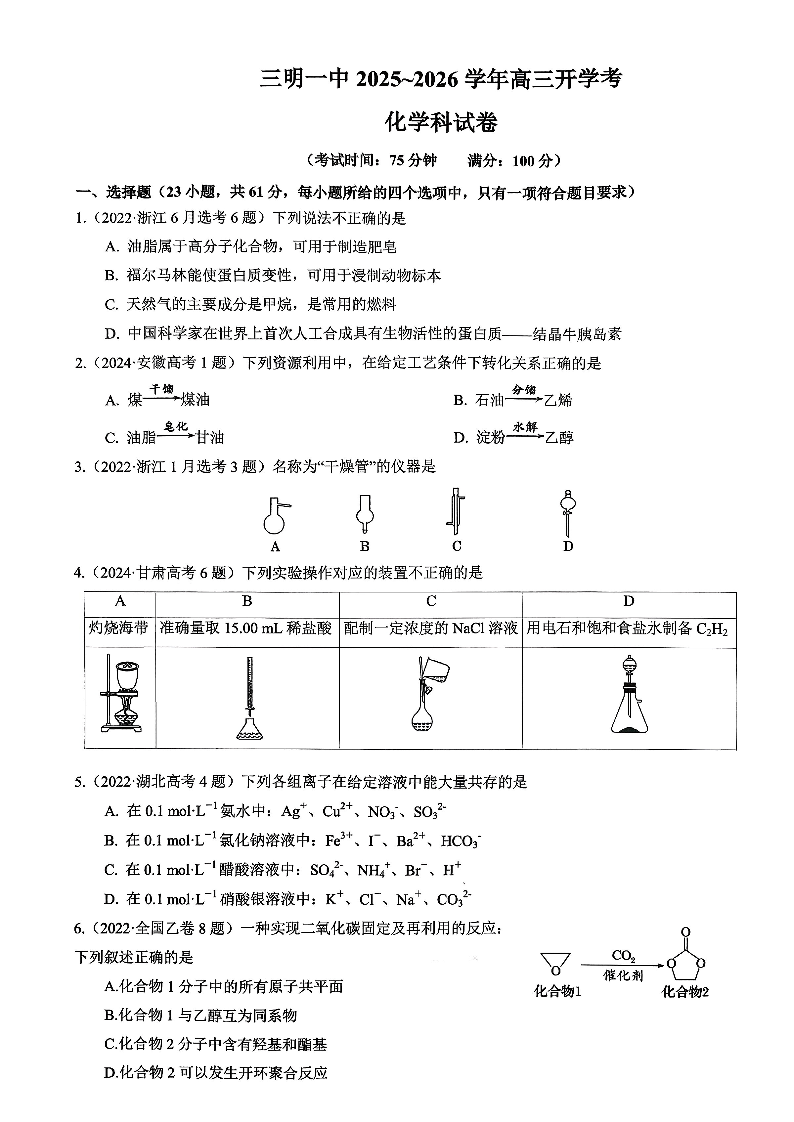 高三化学+答案--福建省三明第一中学2026届高三上学期8月开学考试