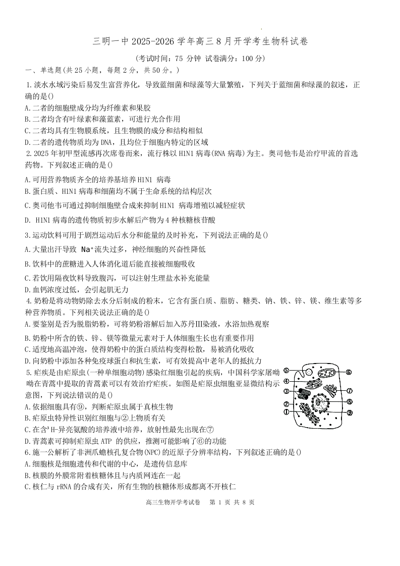 高三生物+答案--福建省三明第一中学2026届高三上学期8月开学考试