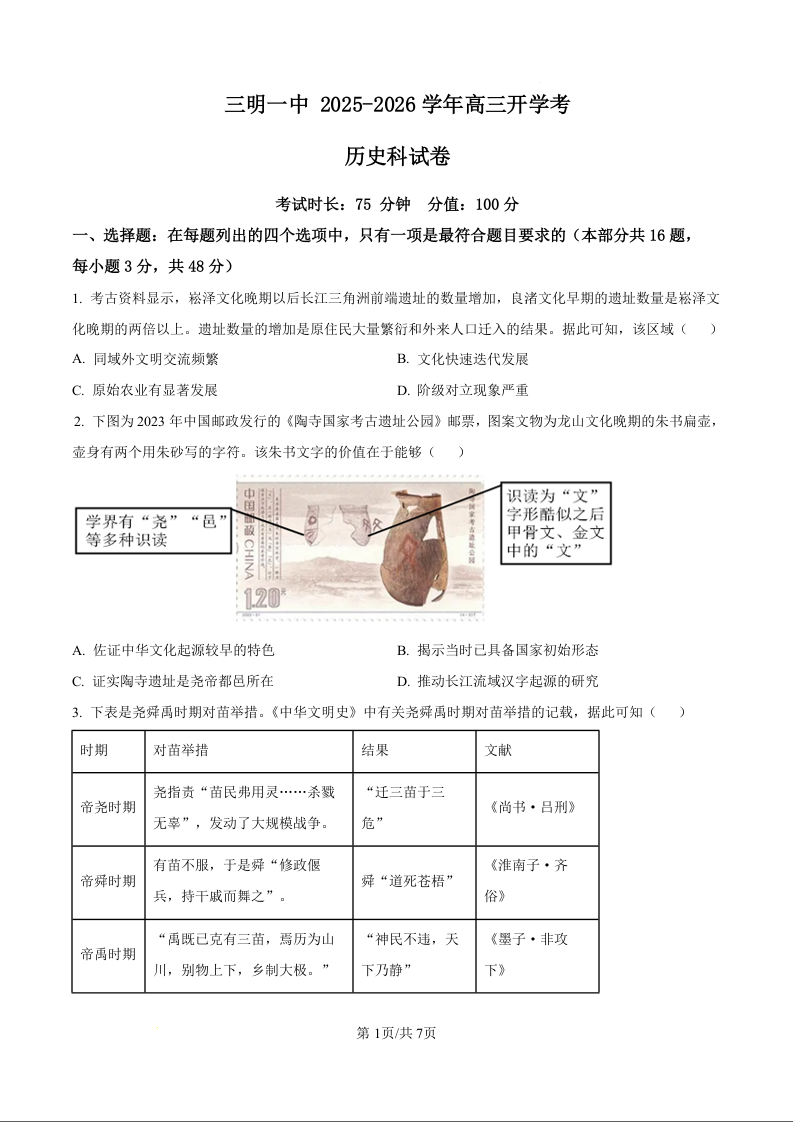 高三历史(原卷版)--福建省三明第一中学2026届高三上学期8月开学考试