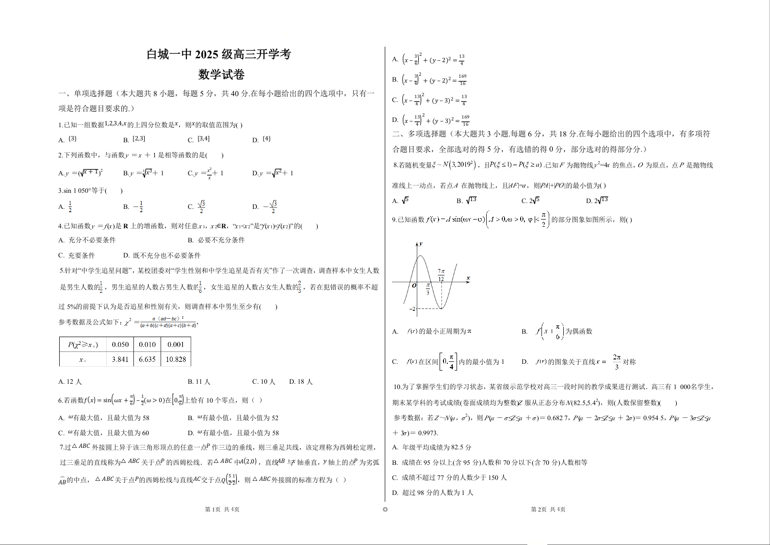高三数学--吉林省白城市第一中学2026届高三上学期8月开学考试