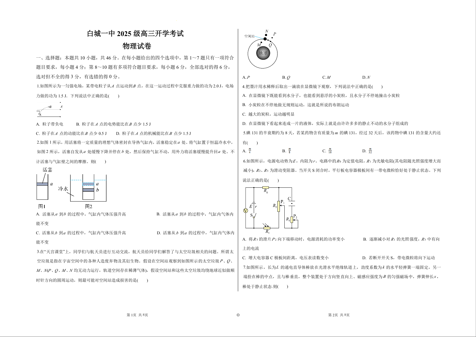 高三物理--吉林省白城市第一中学2026届高三上学期8月开学考试