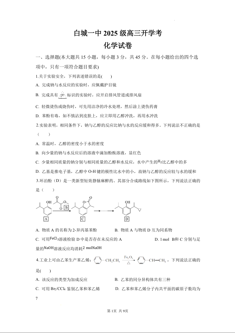 高三化学--吉林省白城市第一中学2026届高三上学期8月开学考试
