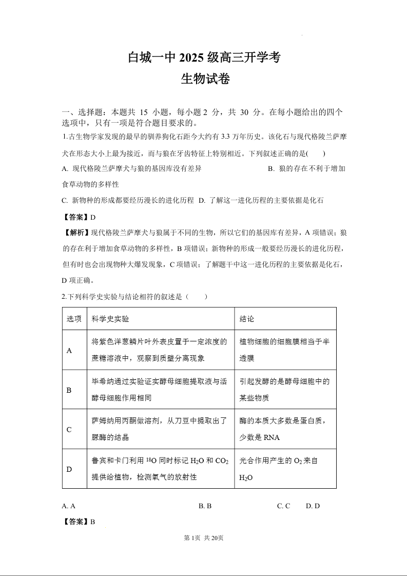 高三生物答案--吉林省白城市第一中学2026届高三上学期8月开学考试