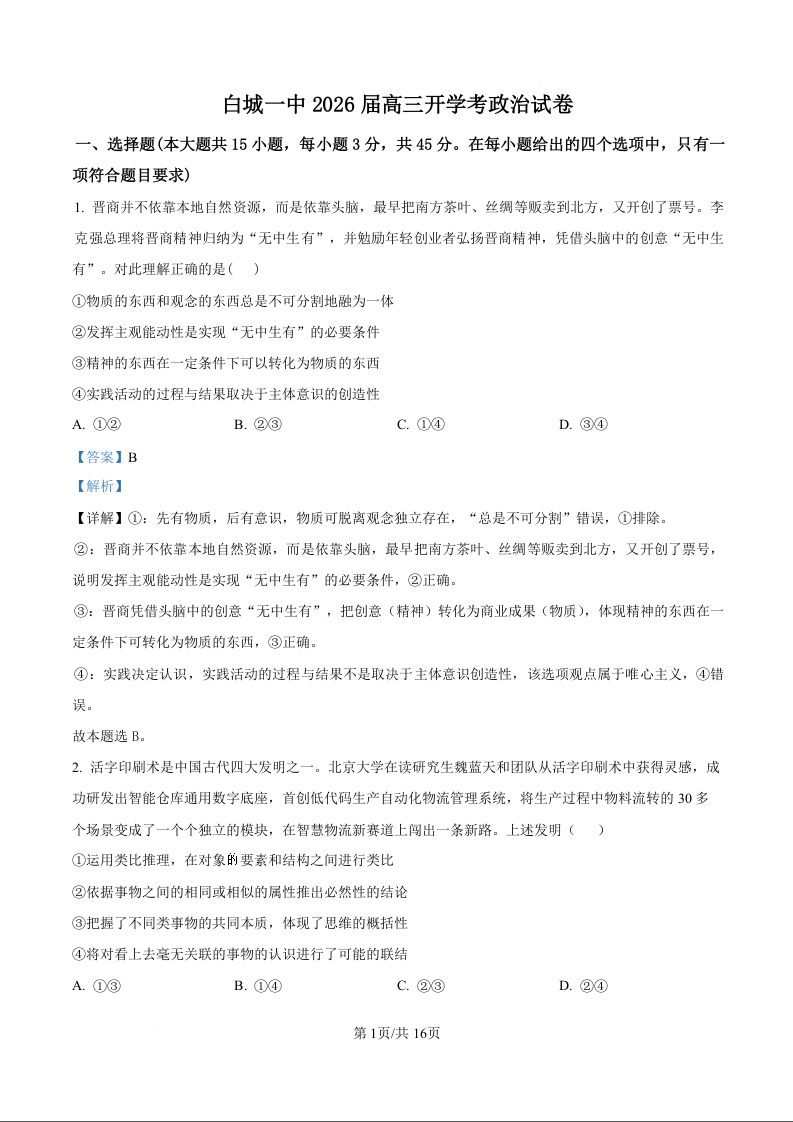 高三政治(精品解析版)--吉林省白城市第一中学2026届高三上学期8月开学考试