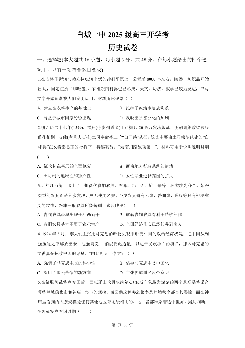 高三历史--吉林省白城市第一中学2026届高三上学期8月开学考试