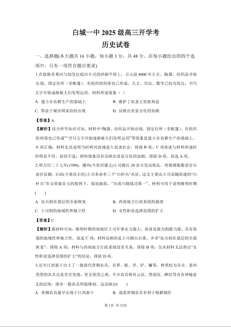 高三历史答案--吉林省白城市第一中学2026届高三上学期8月开学考试