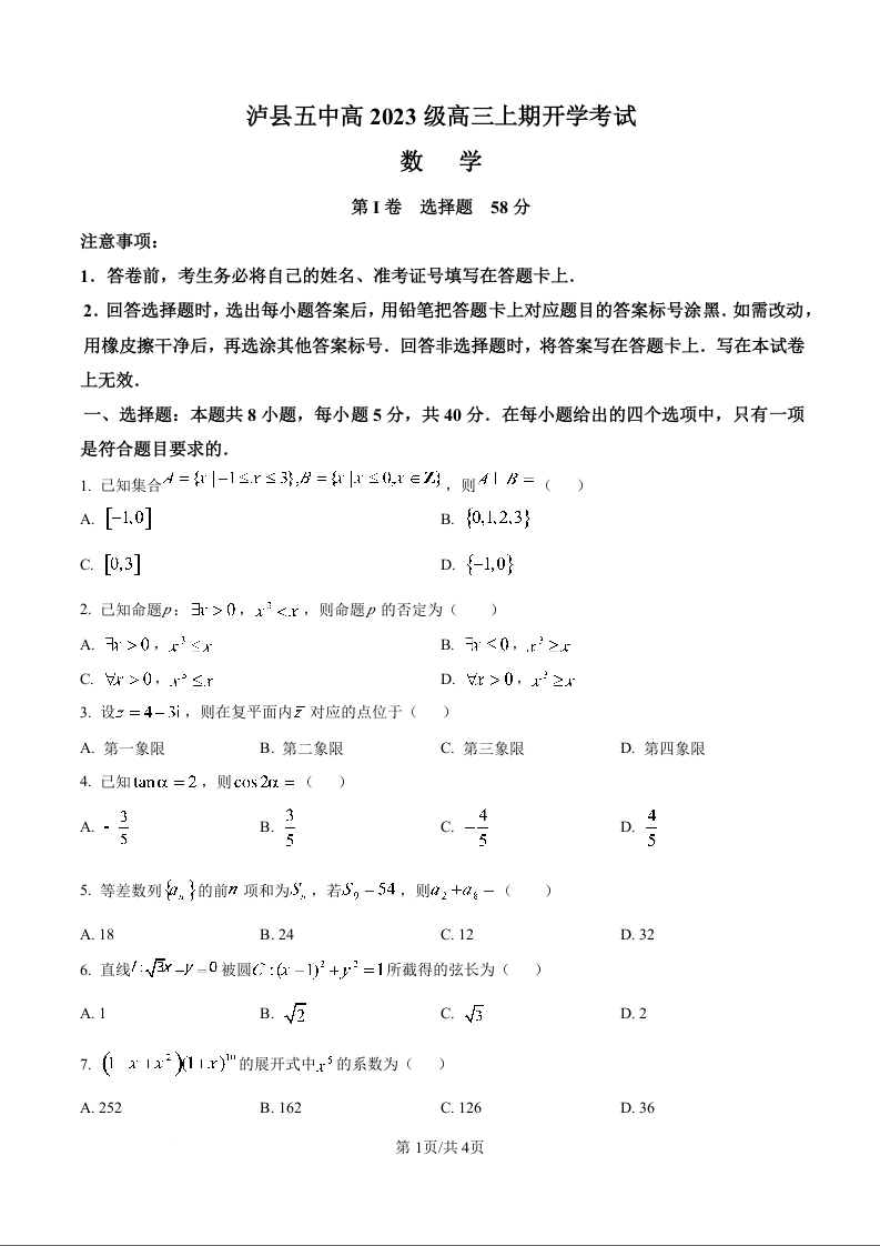 高三数学(原卷版)--四川省泸县第五中学2026届高三上学期8月开学考试