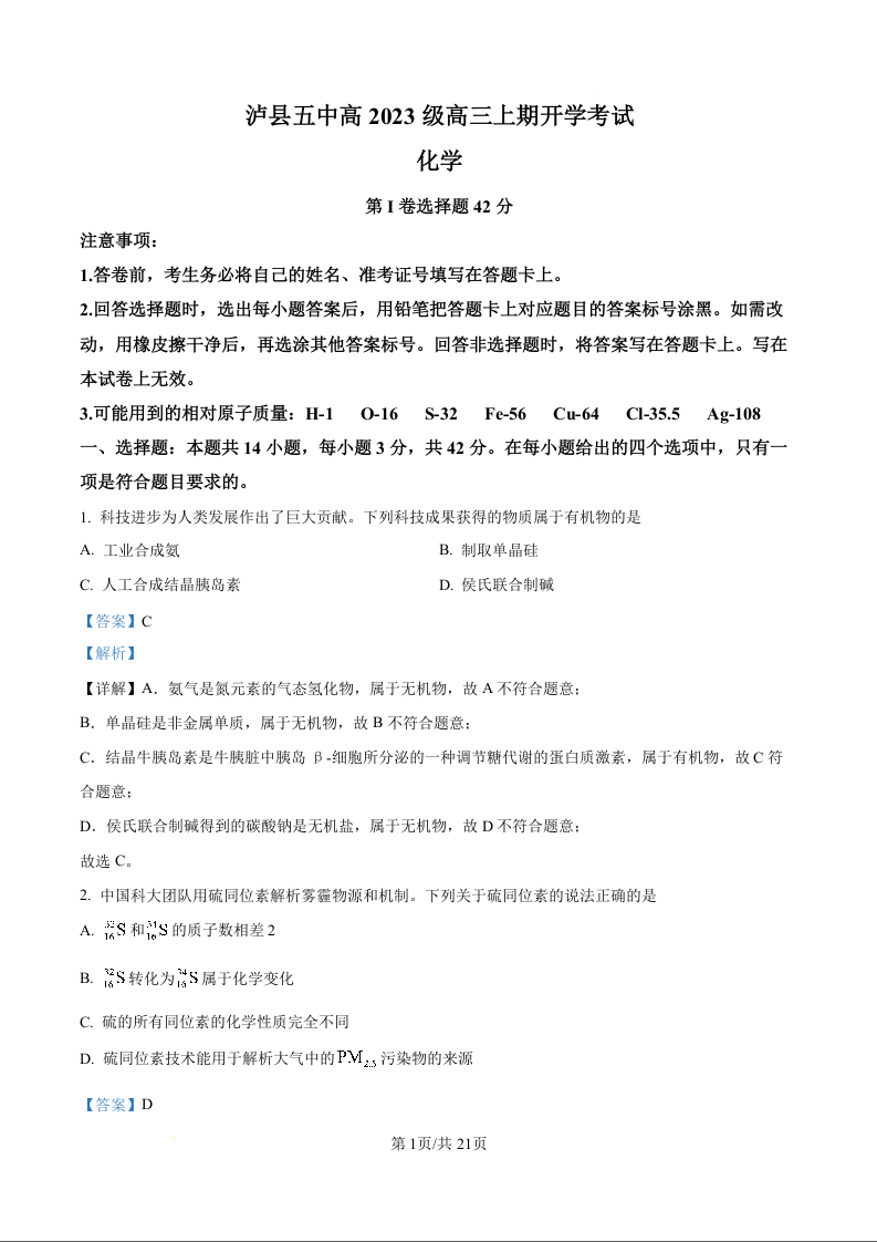 高三化学(精品解析版)--四川省泸县第五中学2026届高三上学期8月开学考试