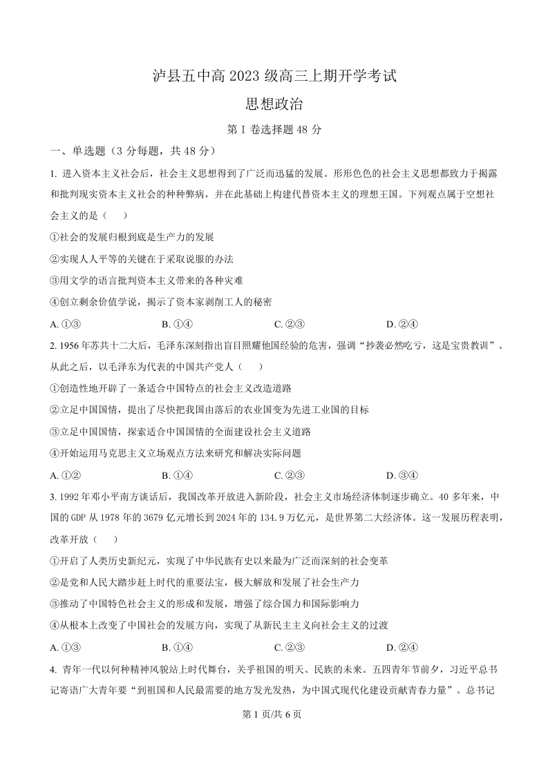 高三政治(原卷版)--四川省泸县第五中学2026届高三上学期8月开学考试