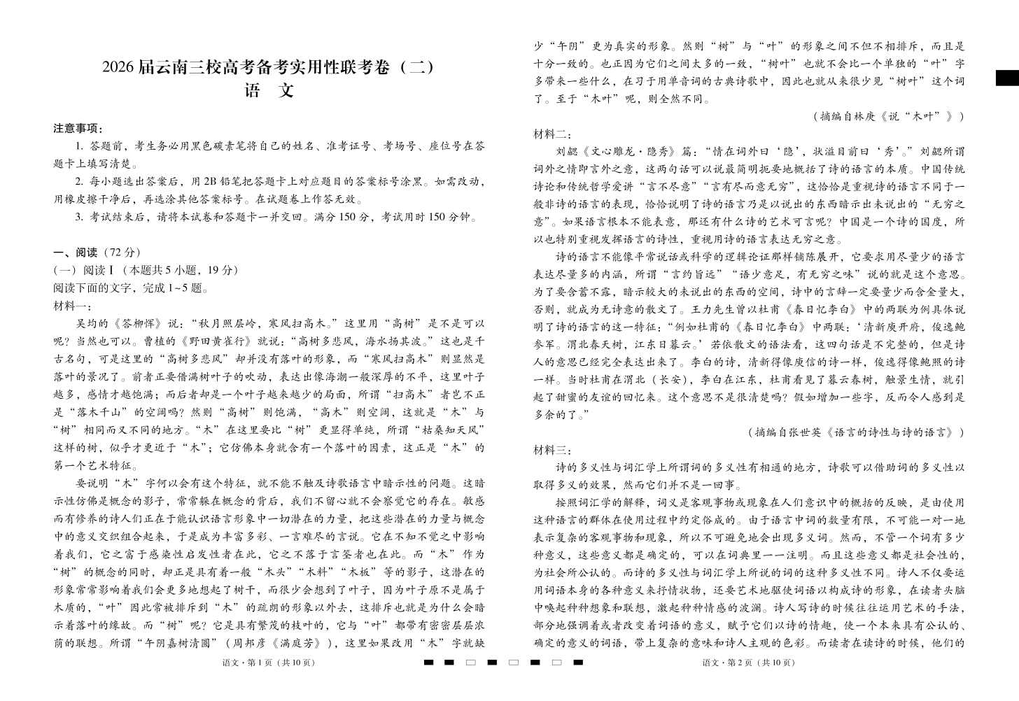 高三语文--云南三校2026届高考备考实用性8月联考卷(二)