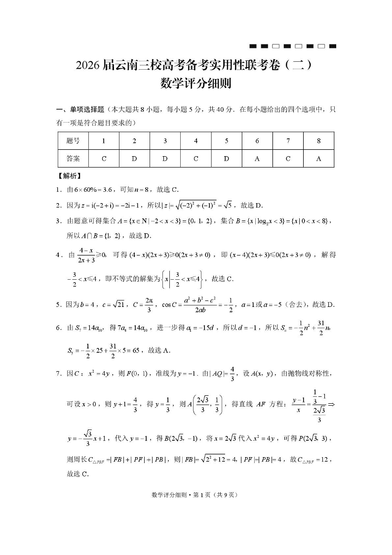 高三数学答案--云南三校2026届高考备考实用性8月联考卷(二)
