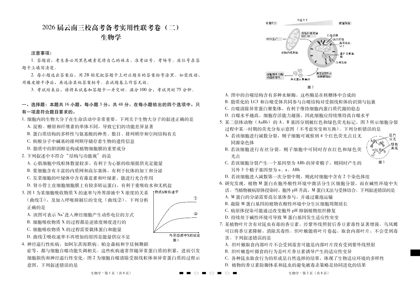 高三生物--云南三校2026届高考备考实用性8月联考卷(二)