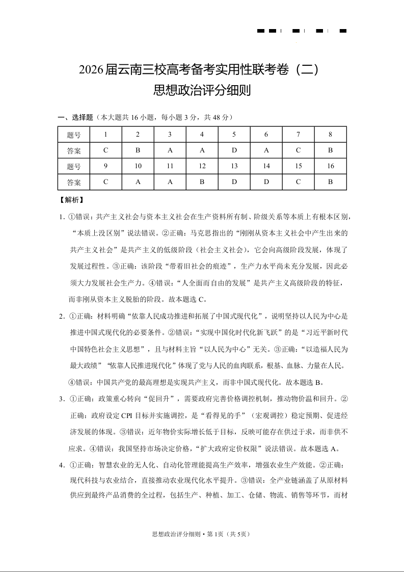 高三政治答案--云南三校2026届高考备考实用性8月联考卷(二)