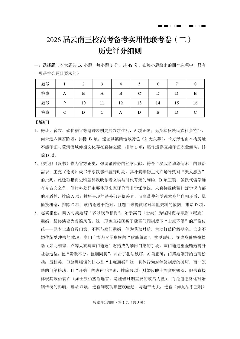 高三历史答案--云南三校2026届高考备考实用性8月联考卷(二)