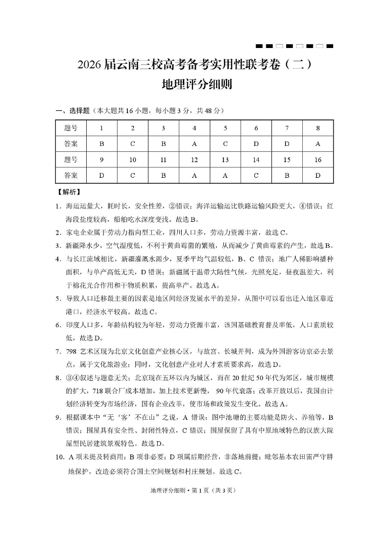 高三地理答案--云南三校2026届高考备考实用性8月联考卷(二)