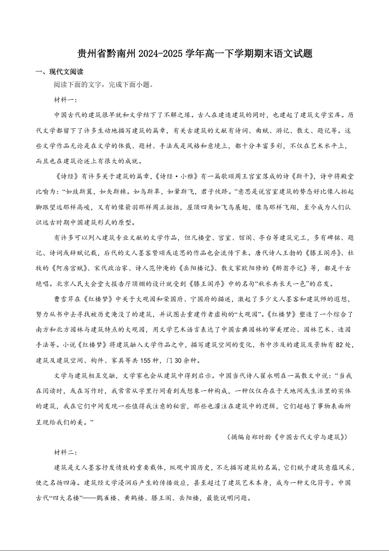 高三语文+答案--贵州省黔南州2024-2025学年高一下学期期末考试