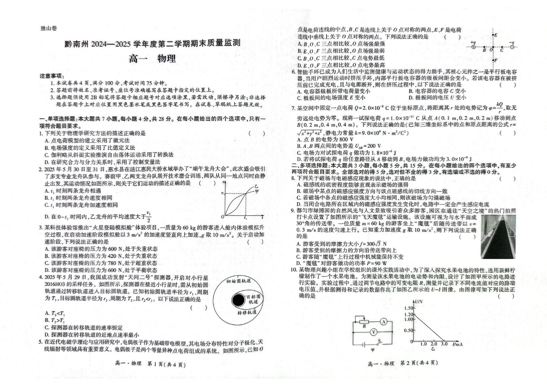 高三物理+答案--贵州省黔南州2024-2025学年高一下学期期末考试