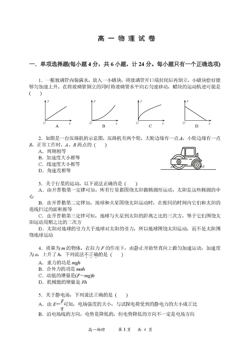 高一物理+答案--湖南省娄底市部分普通高中2024-2025学年高一下学期期末考试