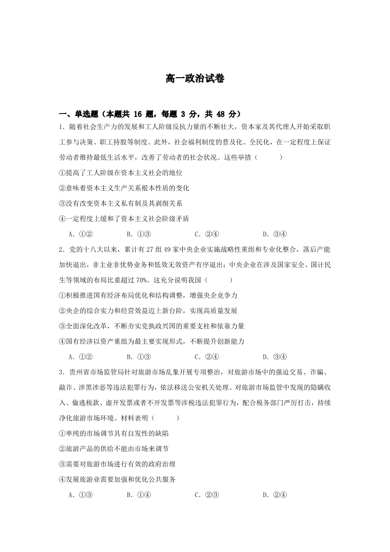 高一政治+答案--湖南省娄底市部分普通高中2024-2025学年高一下学期期末考试