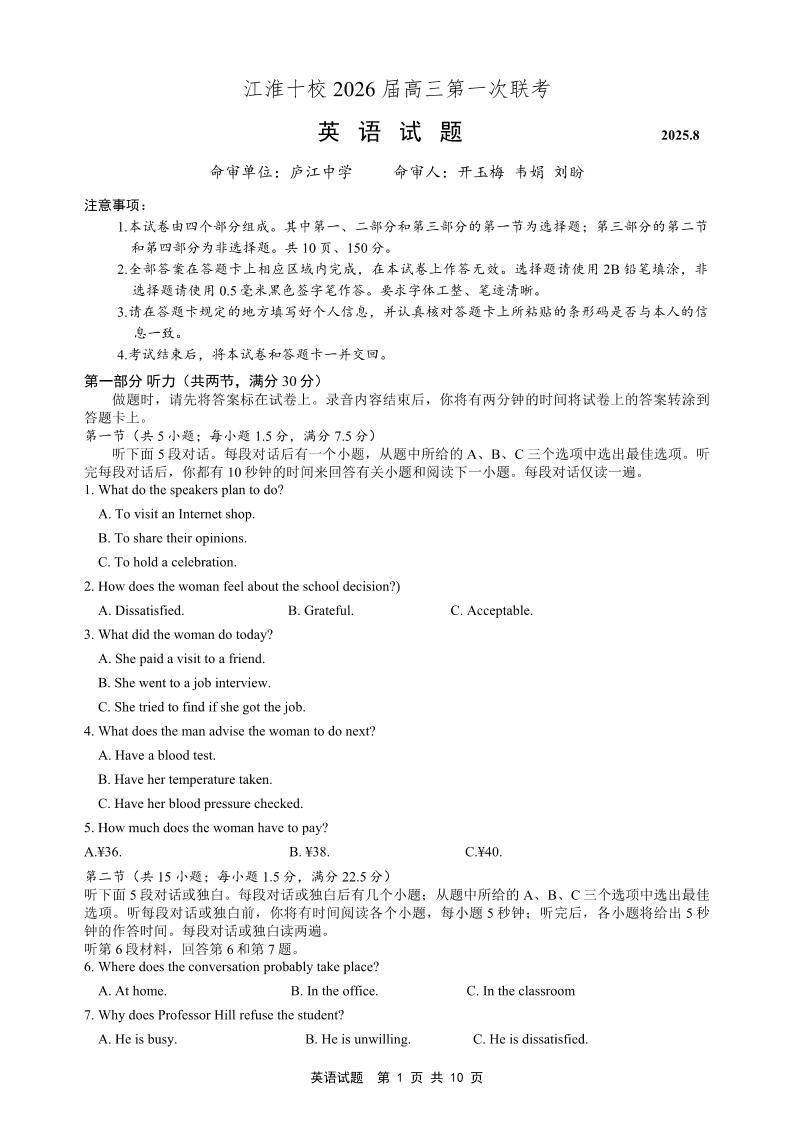 高三英语--安徽省江淮十校2026届高三上学期第一次联考