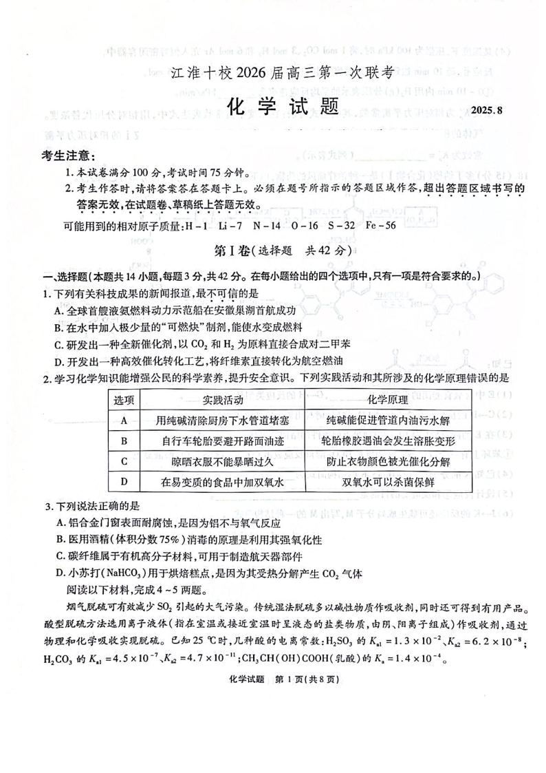 高三化学+答案--安徽省江淮十校2026届高三上学期第一次联考