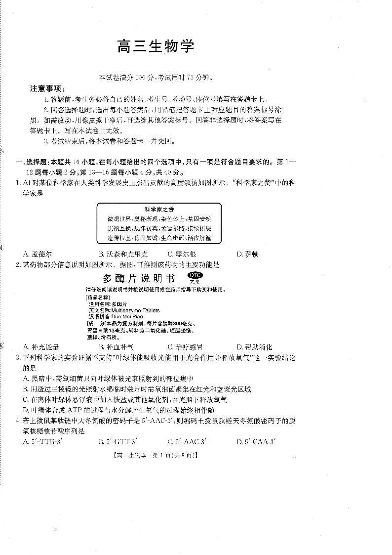 高三生物--广东省2026届高三8月开学联考(05C)