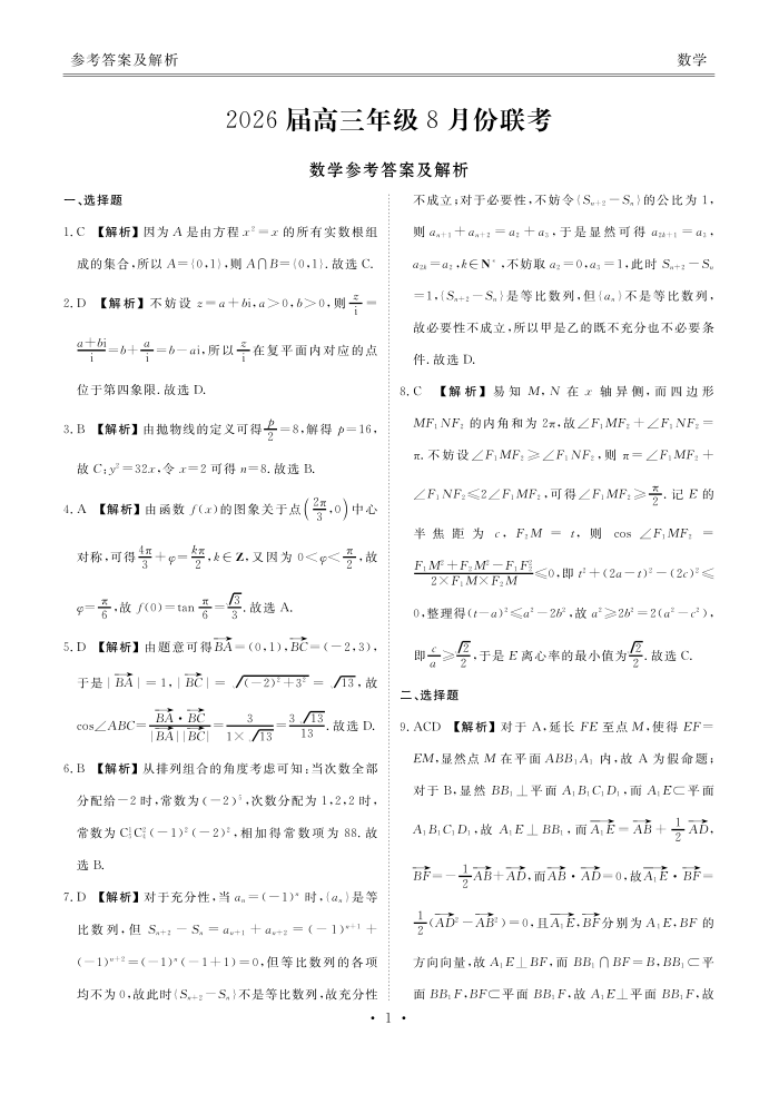 高三数学答案--广东省衡水金卷2026届高三8月开学联考