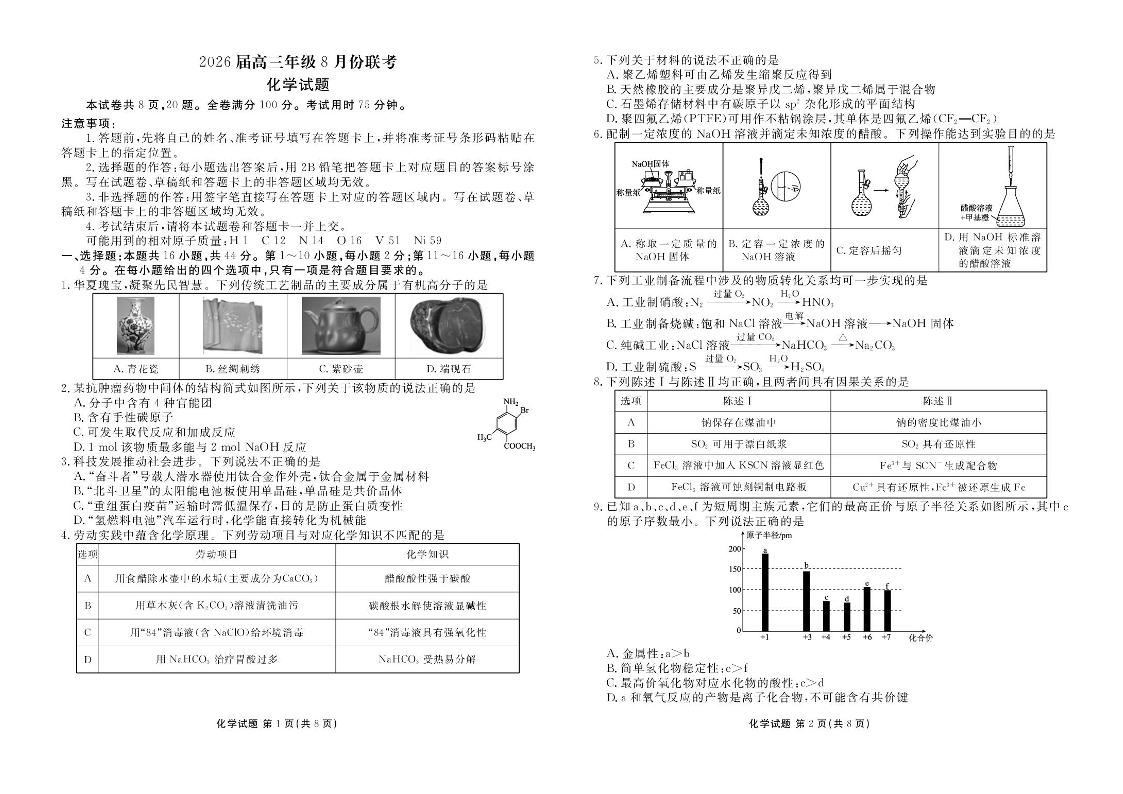 高三化学--广东省衡水金卷2026届高三8月开学联考