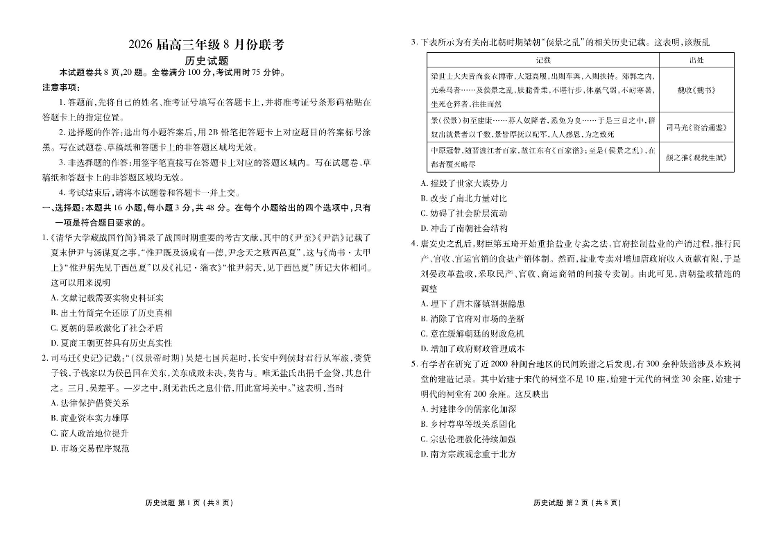 高三历史--广东省衡水金卷2026届高三8月开学联考
