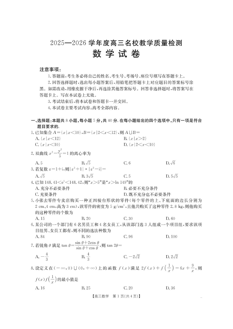 高三数学+答案--内蒙古2026届高三8月名校教学质量检测