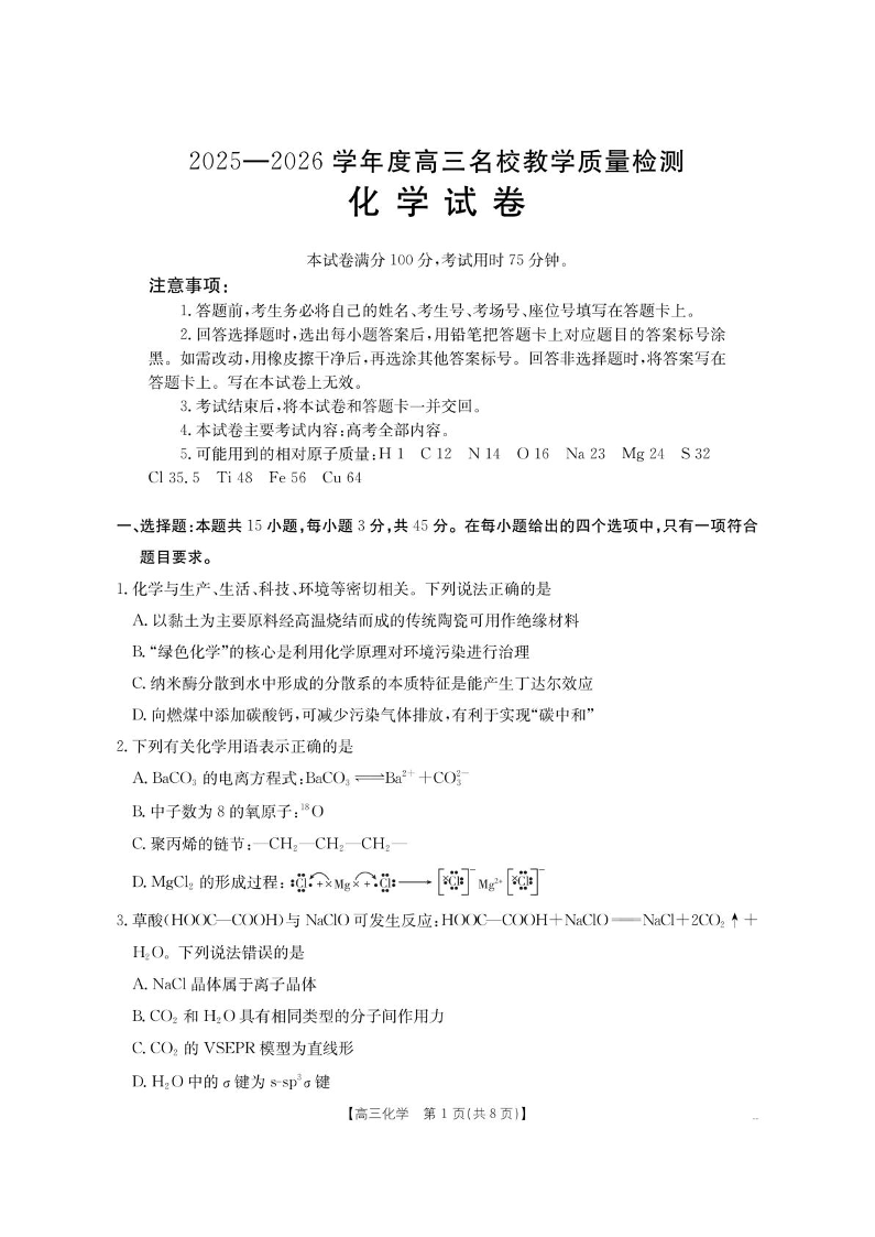 高三化学+答案--内蒙古2026届高三8月名校教学质量检测