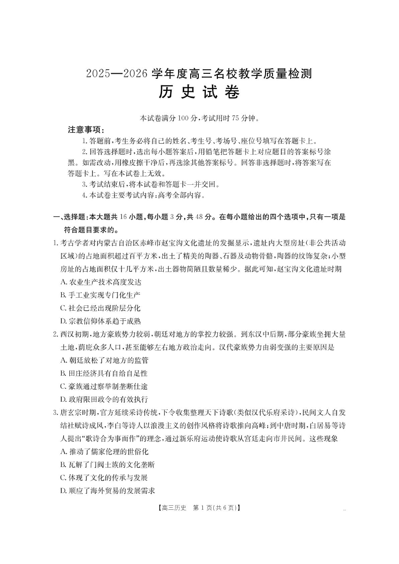 高三历史+答案--内蒙古2026届高三8月名校教学质量检测