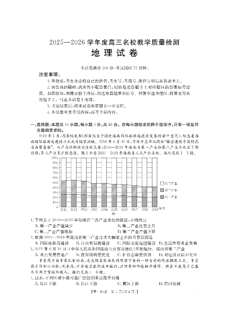 高三地理--内蒙古2026届高三8月名校教学质量检测