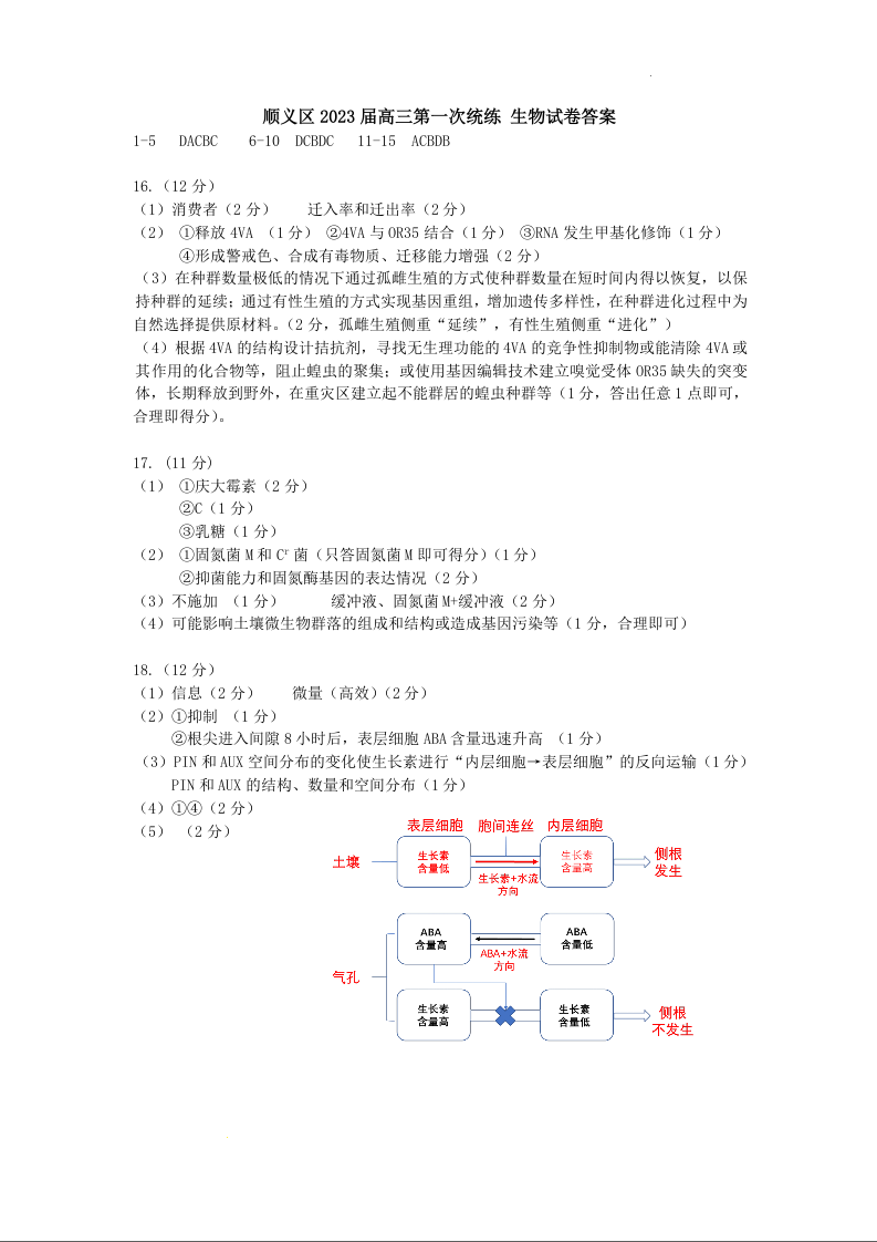 高三生物答案--北京市顺义区2023届高三第一次统练