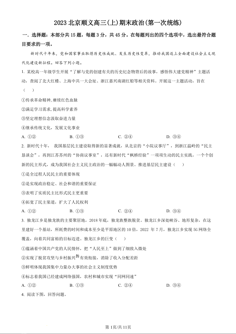 高三政治(原卷版)--北京市顺义区2023届高三第一次统练