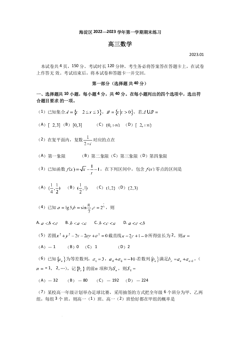 高三数学--北京市海淀区2022-2023学年高三上学期期末考试