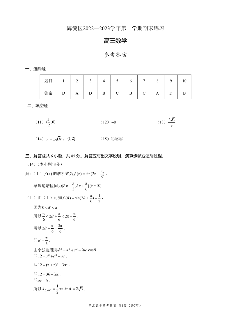 高三数学答案--北京市海淀区2022-2023学年高三上学期期末考试