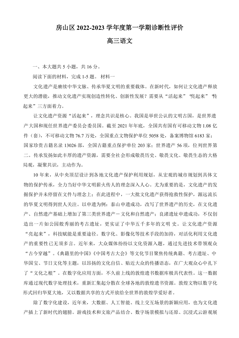 高三语文--北京市房山区2023届高三上学期1月期末