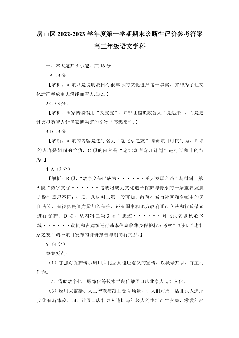 高三语文答案--北京市房山区2023届高三上学期1月期末