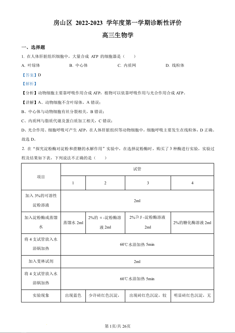 高三生物(解析版)--北京市房山区2023届高三上学期1月期末