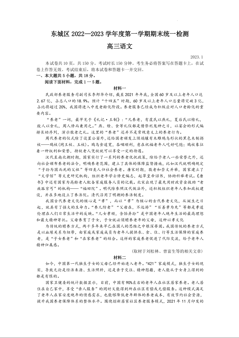 高三语文--北京市东城区高三上学期期末统一检测