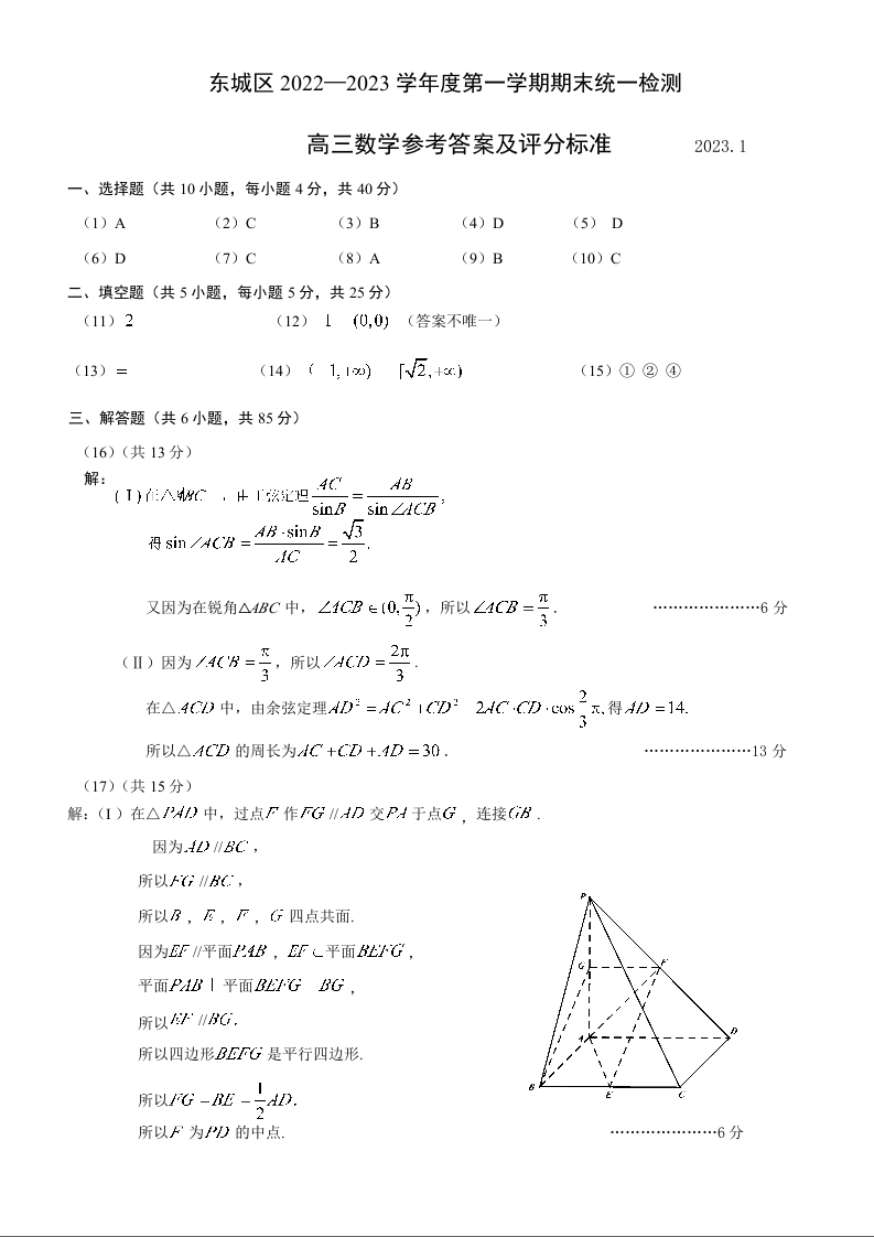 高三数学答案--北京市东城区高三上学期期末统一检测