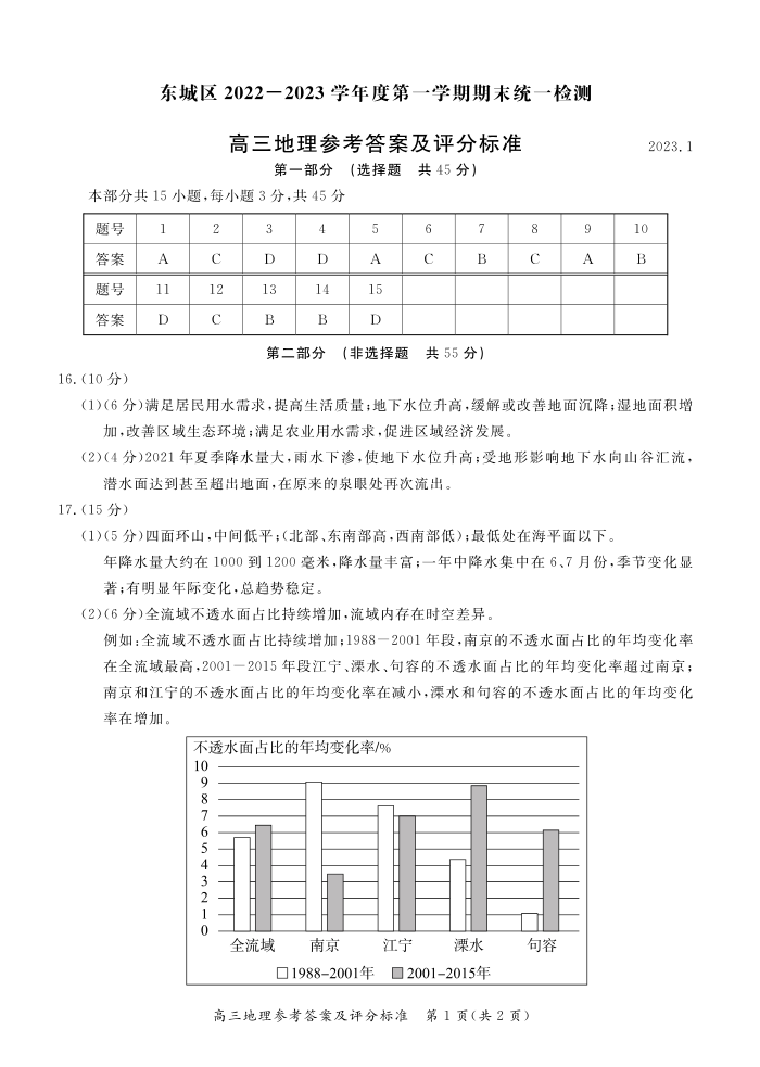 高三地理答案--北京市东城区高三上学期期末统一检测