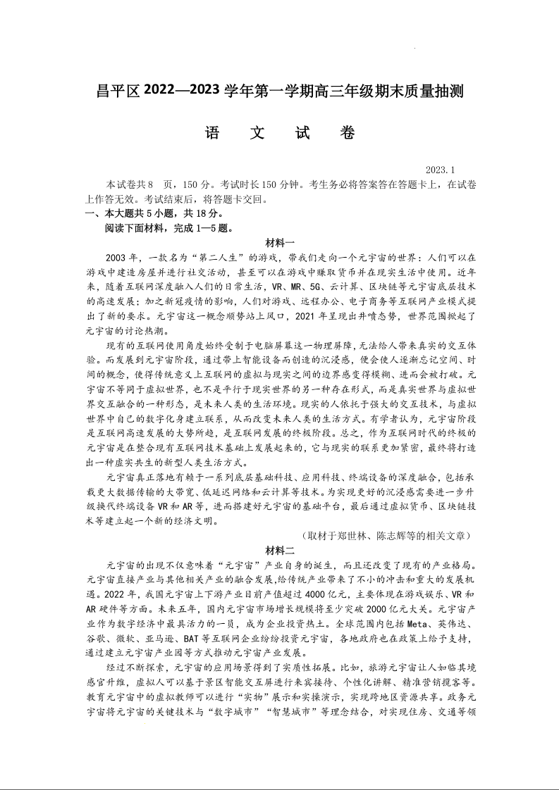 高三语文--北京市昌平区2023届高三上学期期末质量抽测