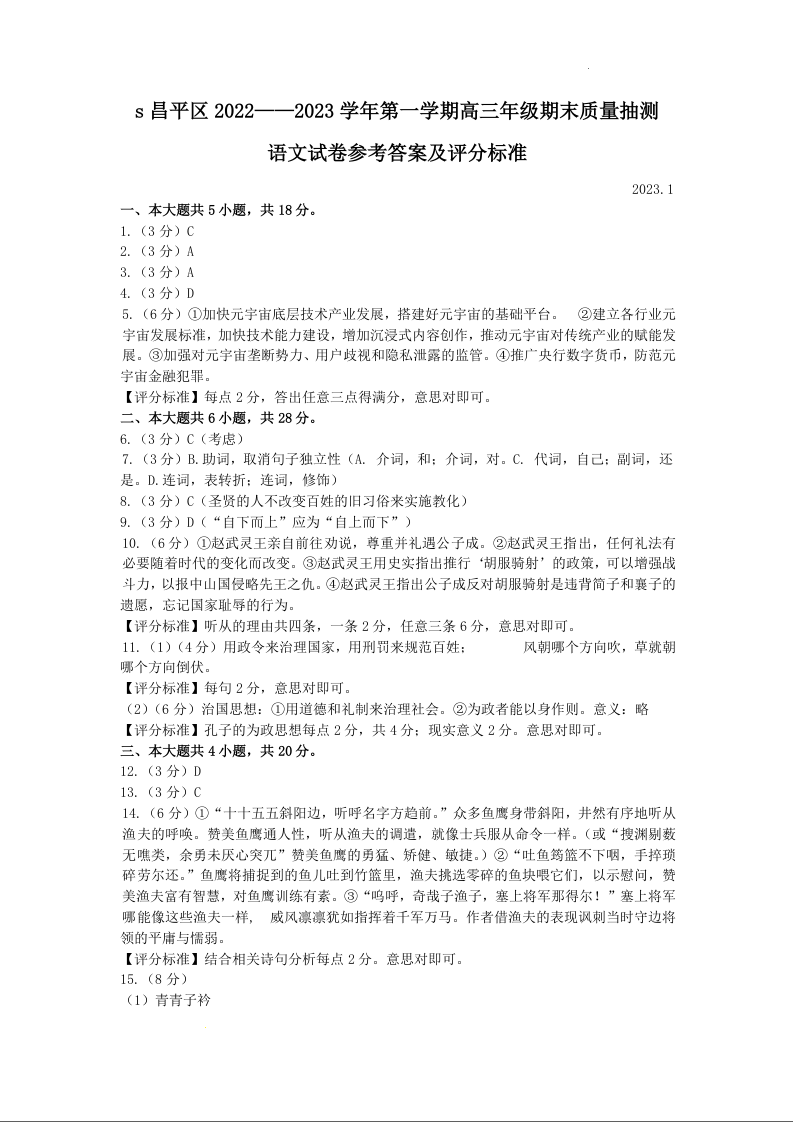 高三语文答案--北京市昌平区2023届高三上学期期末质量抽测