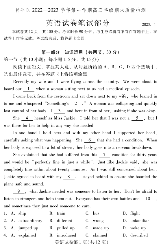 高三英语+答案--北京市昌平区2023届高三上学期期末质量抽测