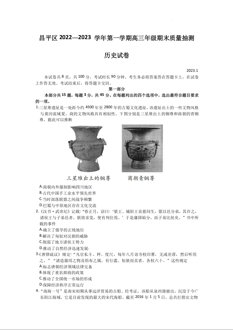 高三历史--北京市昌平区2023届高三上学期期末质量抽测
