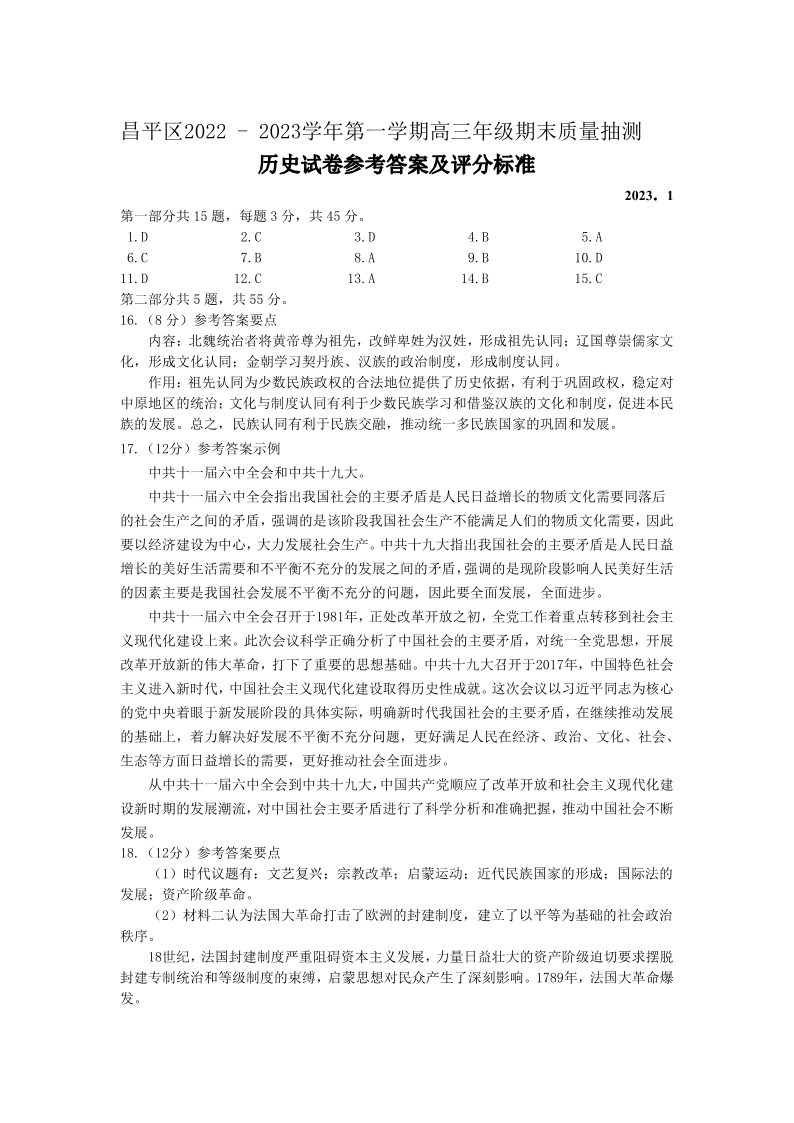 高三历史答案--北京市昌平区2023届高三上学期期末质量抽测