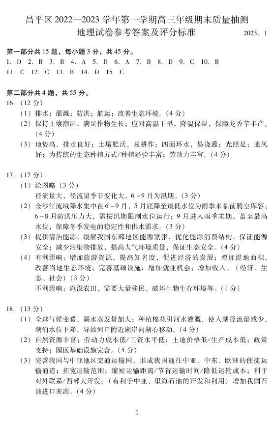 高三地理答案--北京市昌平区2023届高三上学期期末质量抽测
